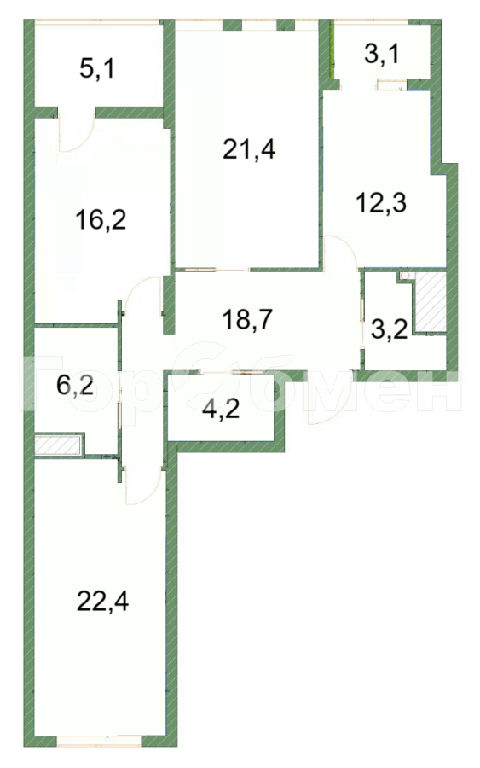 Комнаты: 22.4 21.4 16.2 м2